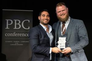 Don Raleigh III (R) receives the Top Payments Leader Award from Joshua Radbod at the PBC Conference, honoring his compliant financial systems for the cannabis industry.